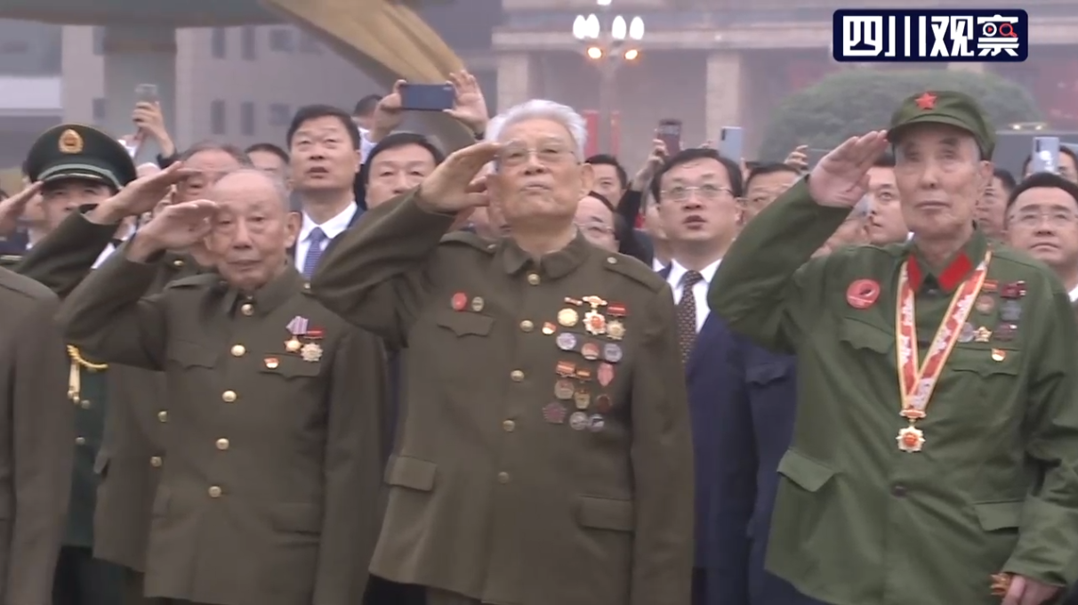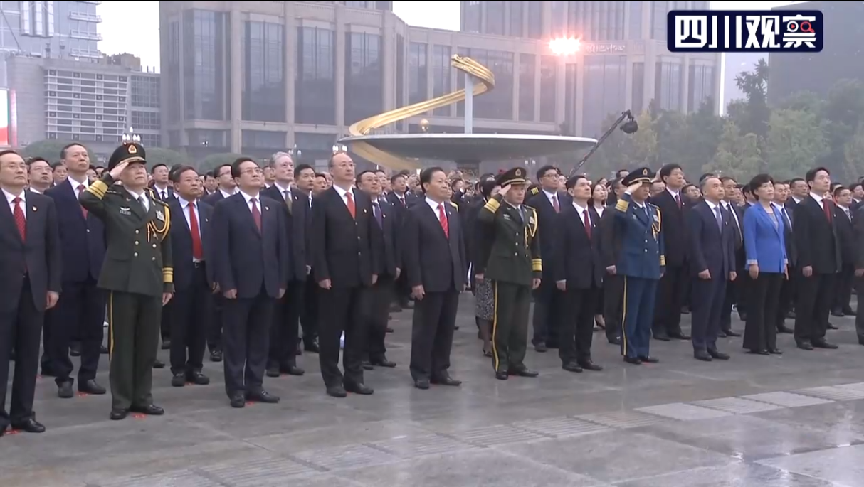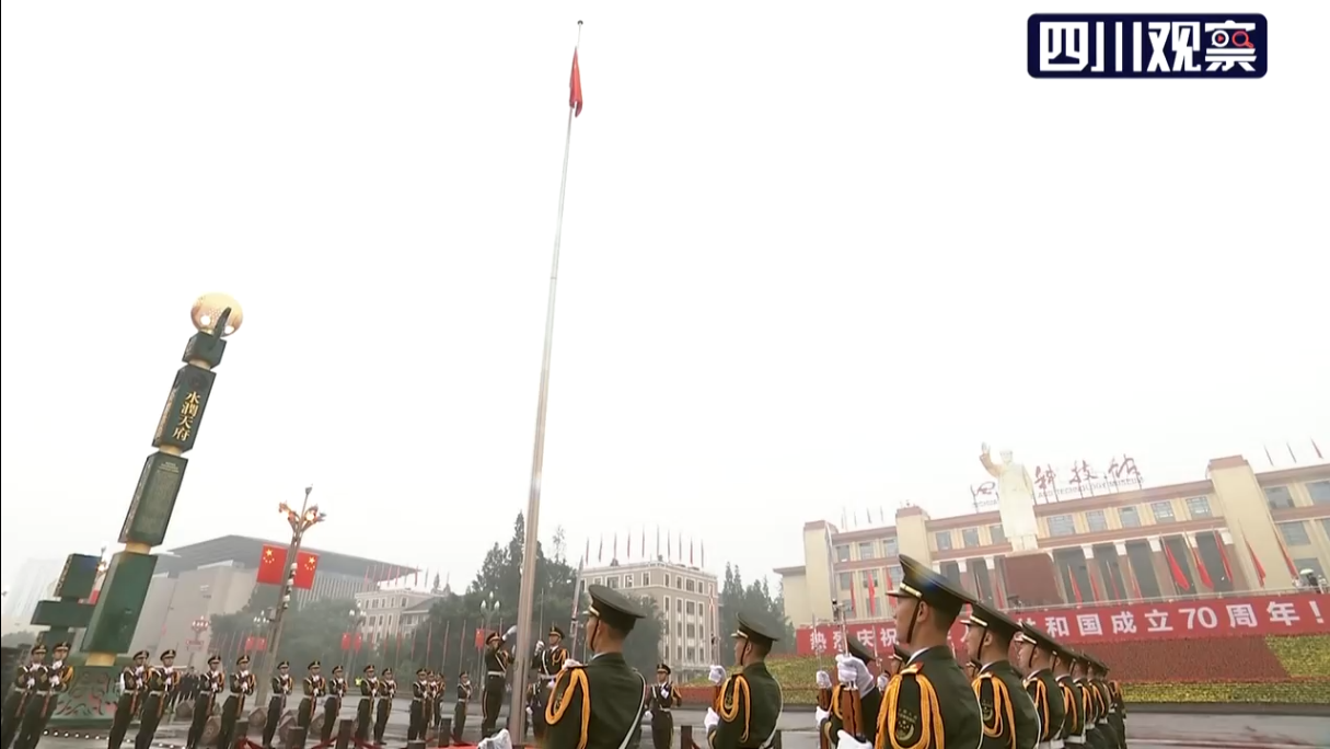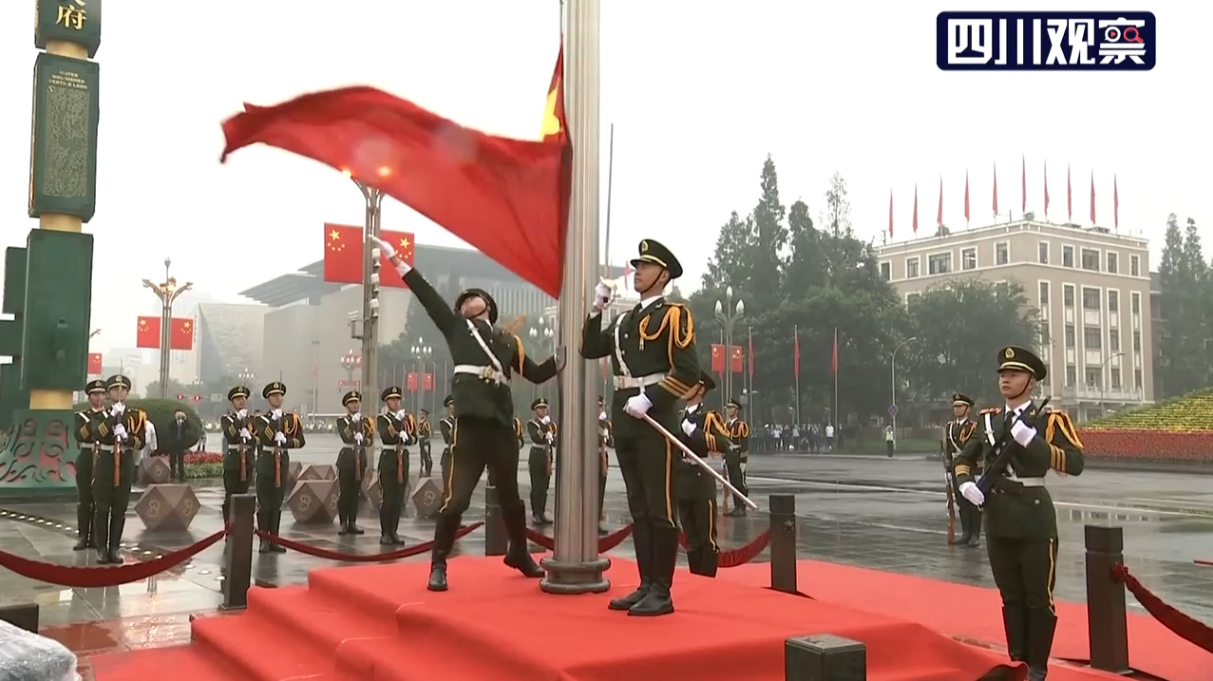 当国旗升至顶端,现场欢声雷动,广场上又响起了《歌唱祖国》的旋律,天府儿女用激越豪迈的歌声赞美祖国,表达为中华民族伟大复兴而奋斗的壮志豪情。