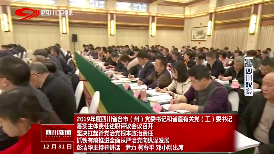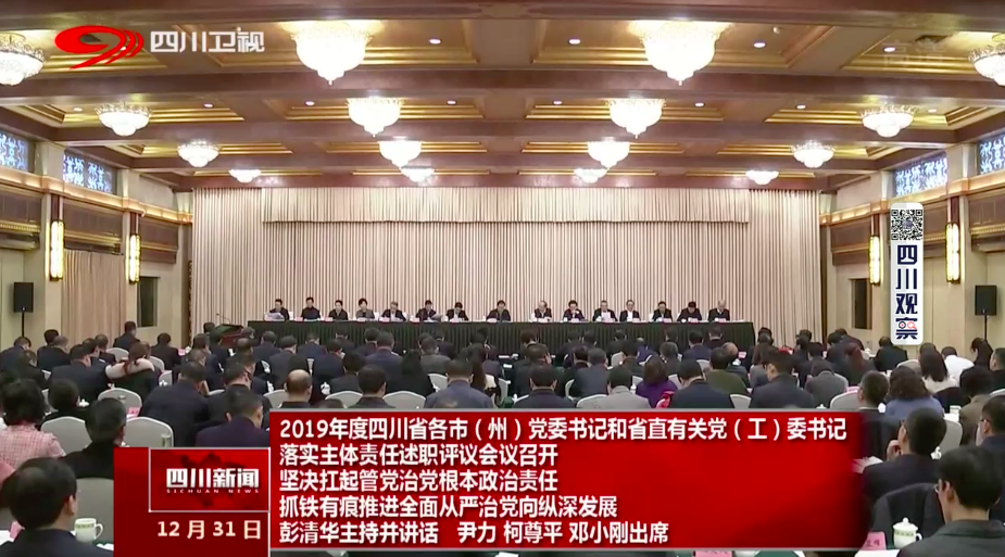 12月31日,2019年度四川省各市(州)党委书记和省直有关党(工)委书记落实主体责任述职评议会议在成都召开。省委书记彭清华主持会议并讲话。他强调,要坚定以习近平新时代中国特色社会主义思想为指导,全面落实新时代党的建设总要求,不忘初心使命,敢于担当作为,坚决扛起管党治党根本政治责任,抓铁有痕推进全面从严治党向纵深发展。