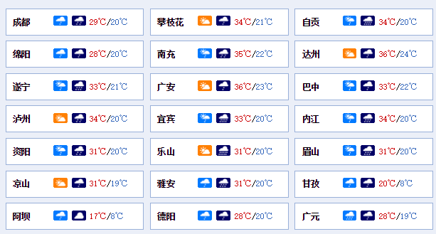 今天白天:盆地大部地方多云,其中西部沿山一带早晚有分散性阵雨或雷雨;川西高原多云间晴,其中阿坝州东部和甘孜州南部有分散性阵雨或雷雨,攀西地区阴天间多云,其中凉山州北部有阵雨或雷雨。