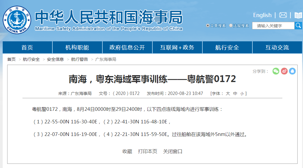 8月23日,中华人民海事局官网发布航行警告《南海,粤东海域军事训练——粤航警0172》:粤航警0172,南海,8月24日0000时至29日2400时,以下四点连线海域内进行军事训练。