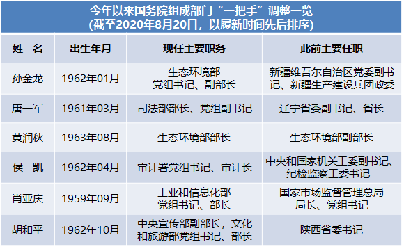 包括胡和平在内,今年已有至少6名干部履新国务院组成部门“一把手”,涉及工业和信息化部、司法部、生态环境部、文化和旅游部、审计署等5个部门。