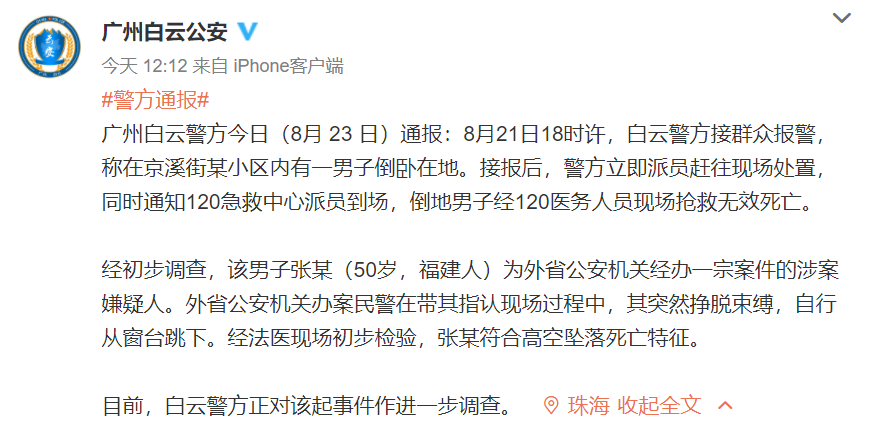 ▲广州一嫌犯指认现场时挣脱束缚跳楼身亡 事件在调查中