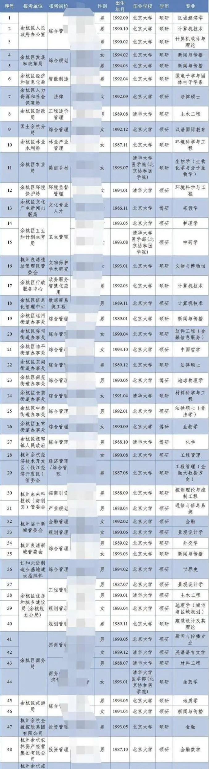 最近几天,杭州市余杭区的一份招聘公示在社交网络上火了。一份长长的公示名单里,清一色是来自清华、北大的毕业生,学历均为硕士研究生和博士研究生,遭到网友质疑。