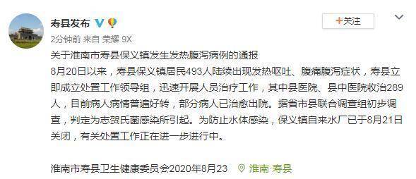 8月20日以来,寿县保义镇居民493人陆续出现发热呕吐、腹痛腹泻症状,寿县立即成立处置工作领导组,迅速开展人员治疗工作。
