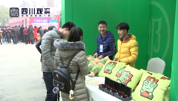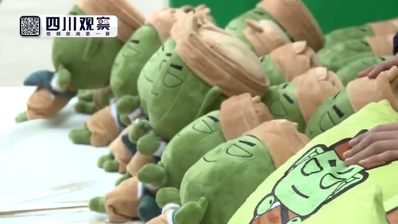 游客易增馨:走到这里看到三星堆这个娃娃,觉得挺符合三星堆这个元素的,挺喜欢的,还觉得挺可爱的,造型就和三星堆面具有点像。文创公仔软萌可爱,融合了“邮政绿”与“青铜绿”,碰撞出“文化跨界”的独特化学反应,方脸、招风耳,绿油油的属性让游客一眼相中,成为“爆款”纪念品。