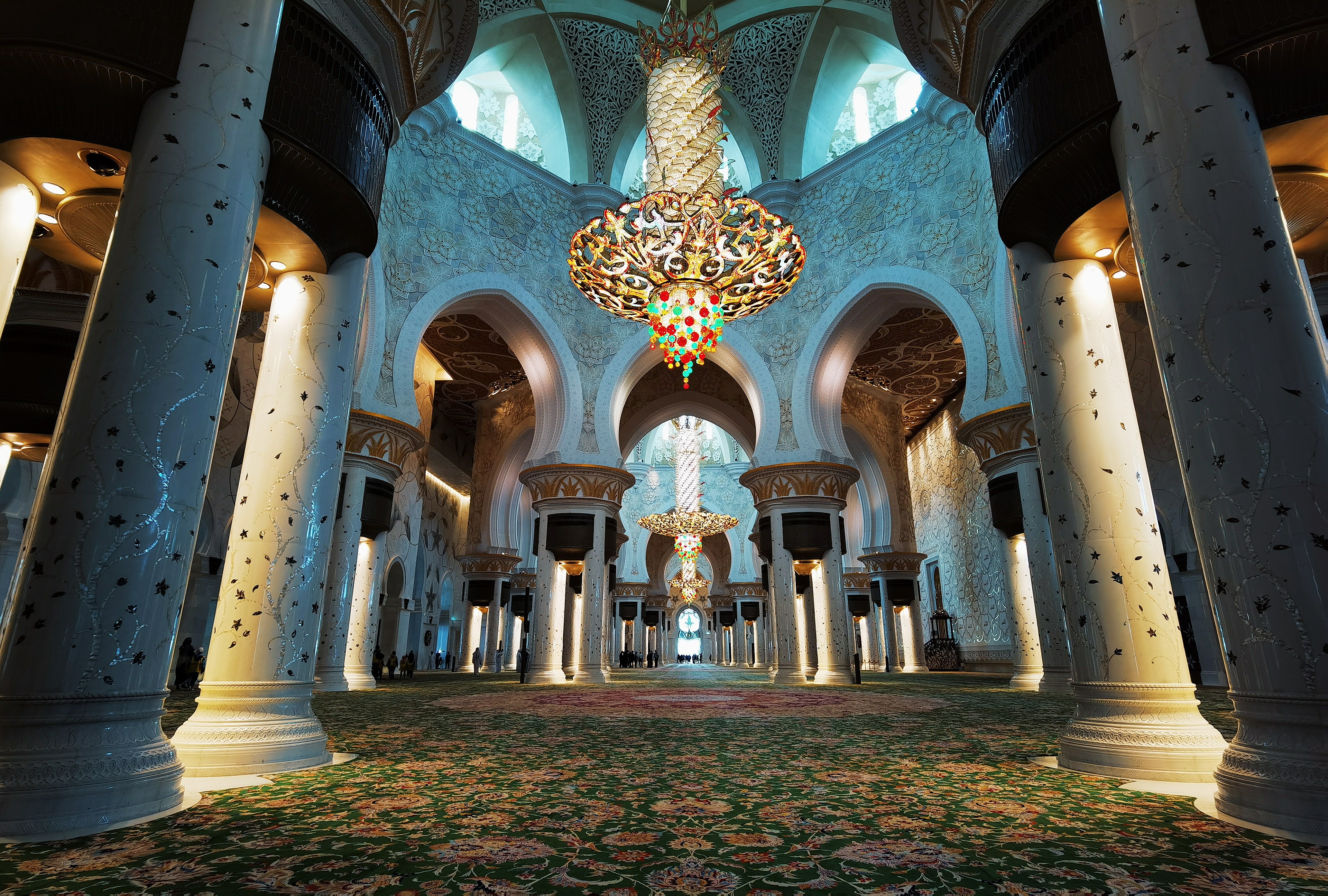 谢赫扎伊德清真寺以奢华异常为世人所熟知,共耗资55亿美元建造,整个建筑群黄色部分几乎都为黄金所铸,共用去了黄金47吨,白色部分则由来自希腊的汉白玉包裹,其精美的雕刻更是来自中国能工巧匠的手艺。