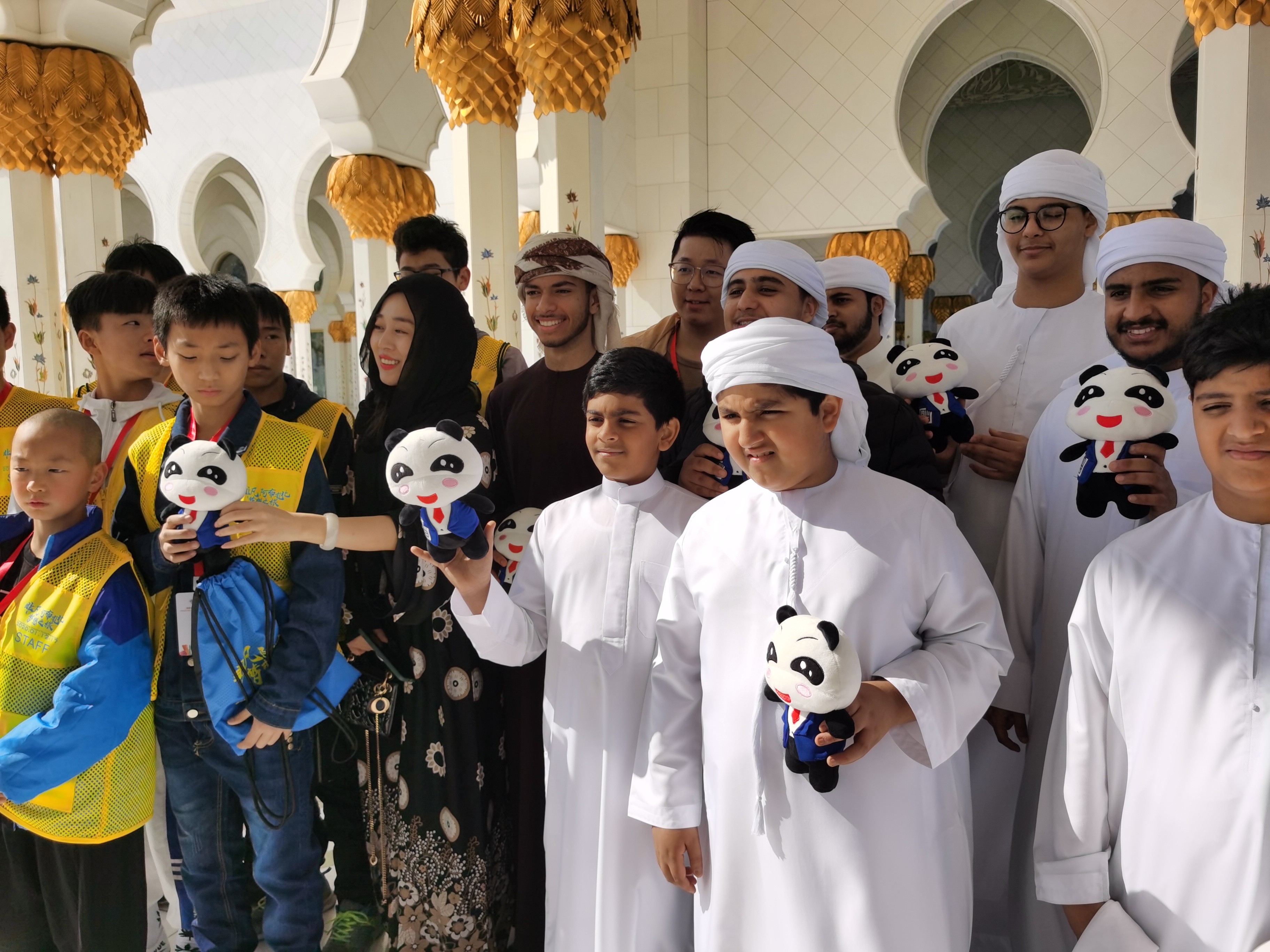 结束参观后,四川的小朋友还将从成都携带而来的观观熊猫赠送给了阿布扎比的青少年,获得礼物的青少年兴奋地用中文叫着“熊猫熊猫”表达喜爱之情。