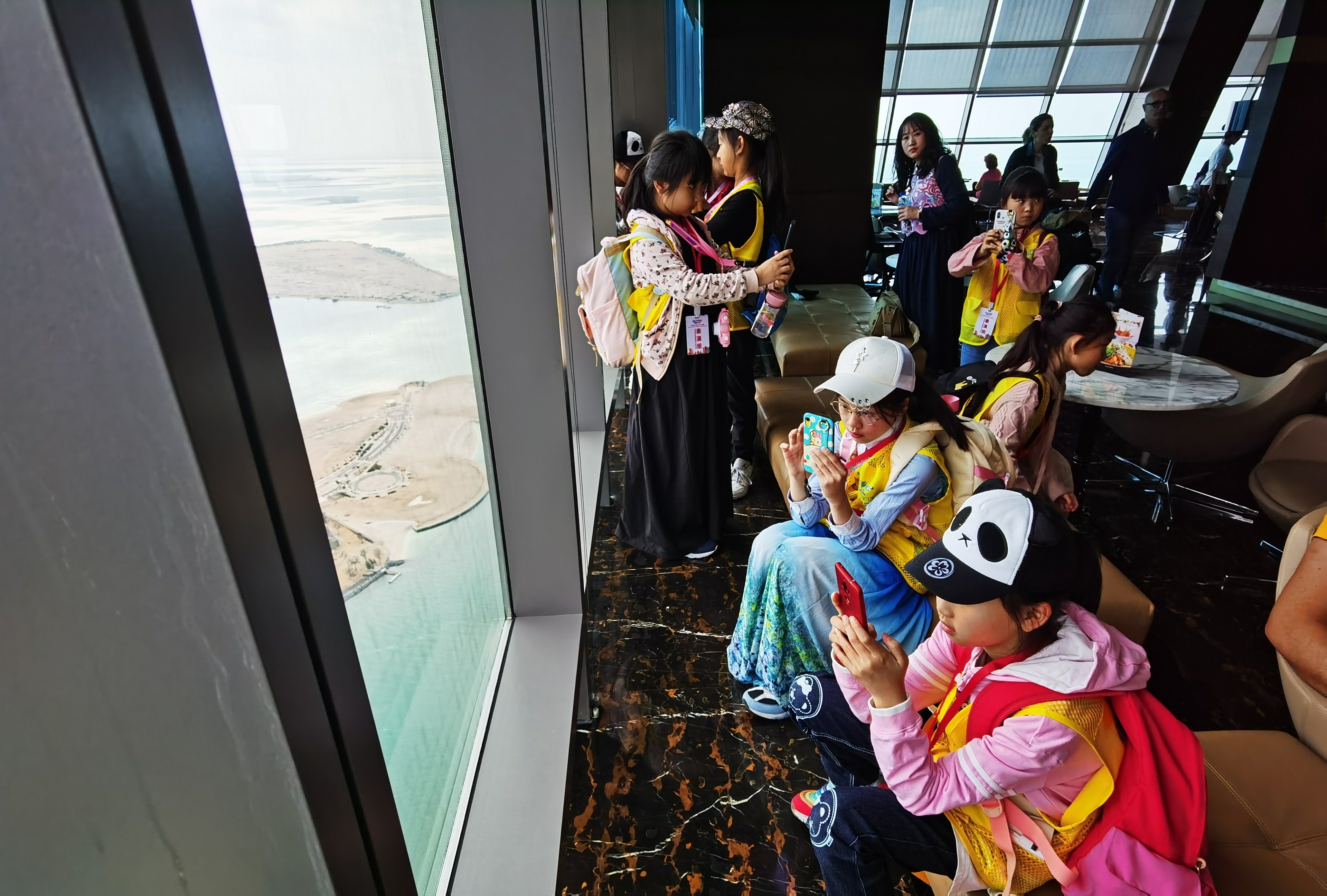 第二站伊提哈德塔,是《速度与激情》7的拍摄地之一,站在74层楼高的全景餐厅,世界上唯一的八星级酒店阿联酋皇宫酒店、阿联酋总统府、阿布扎比首都之门等众多著名景点都可以尽收眼底,来自成都圣菲小学的黄新艺就感叹这座城市好美,“站在这么高的地方看特别漂亮,我们后天的演出也要很精彩才行。”