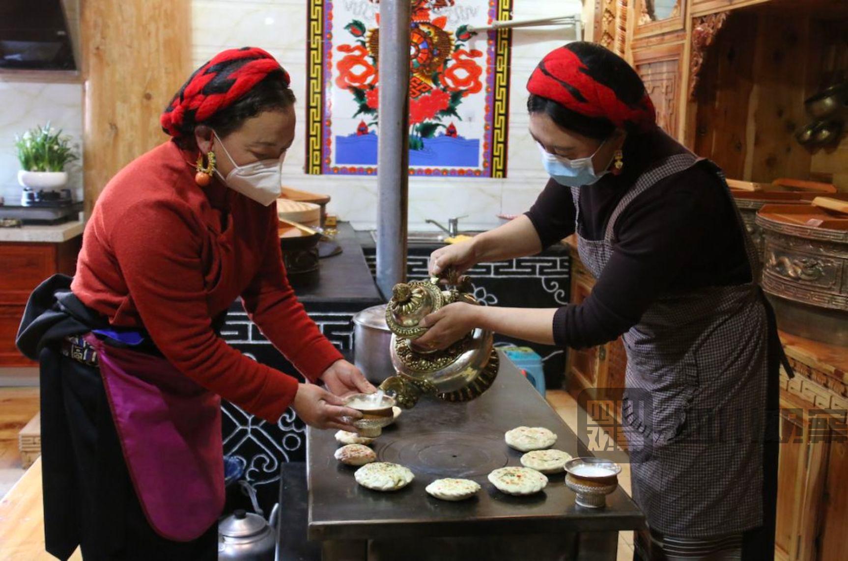 清晨,道孚县鲜水镇团结二村村民降泽正在屋顶煨起桑烟。降泽许下新年愿望,祈求疫病消除、家人平安吉祥。 厨房里,女人们忙了起来,生火、揉面、和馅、压花、贴叶、炕制、点红......亚玛青初和妹妹仲呷在家做起了“花馍馍”。