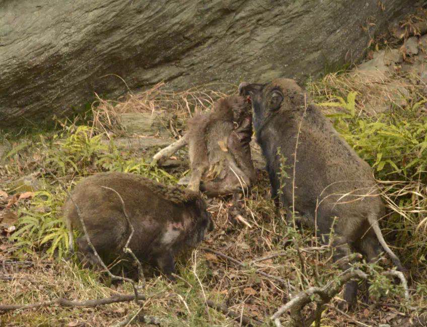 日前,唐家河国家级自然保护区工作人员在保护区进行日常工作巡查中,在蔡家坝保护站百雄关区域发现了一幕“精彩画面”—— 一群野猪在抢食一具动物尸体!细看之下发现,这群野猪由一只雄性、一雌性和一只雄性亚成体组成。