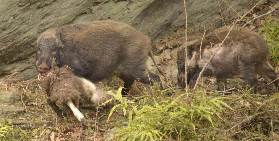 工作人员在长达半个多小时的观察中,根据多年保护经验,推断出它们是一个家庭,经仔细辨认,发现野猪抢食的是一只斑羚尸体。据了解,野猪属于杂食性动物,嗅觉极为灵敏,会吃扭角羚、斑羚、小麂等动物尸体。