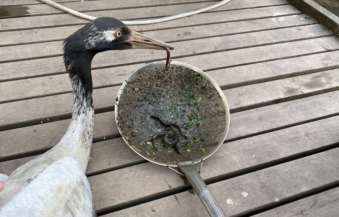 同时,观观与协会工作人员一同赶往雅安鸟类保护协会城市鸟类繁殖观测点,在观测点,工作人员备好了水和活泥鳅,并协助黑颈鹤进食。