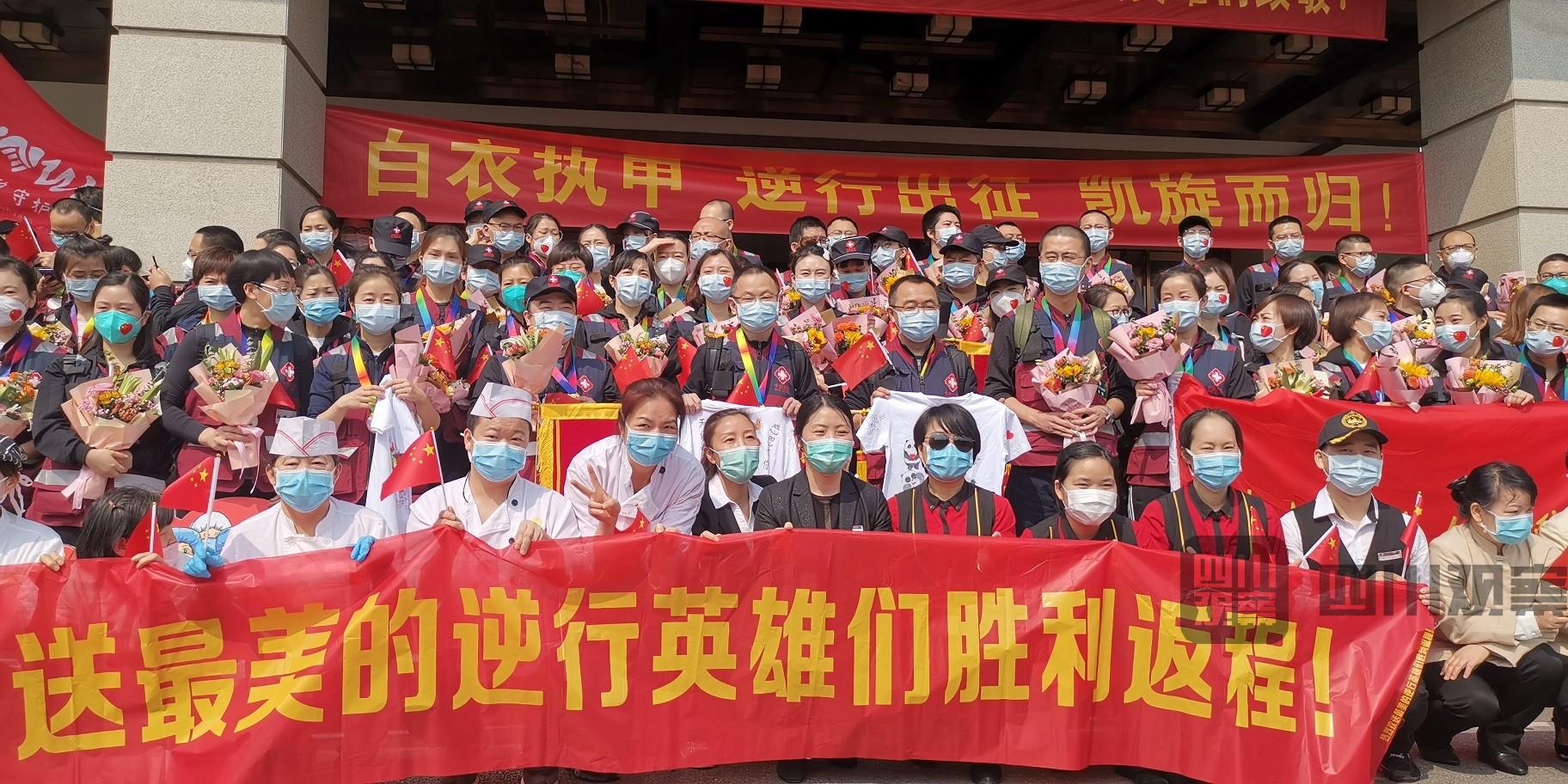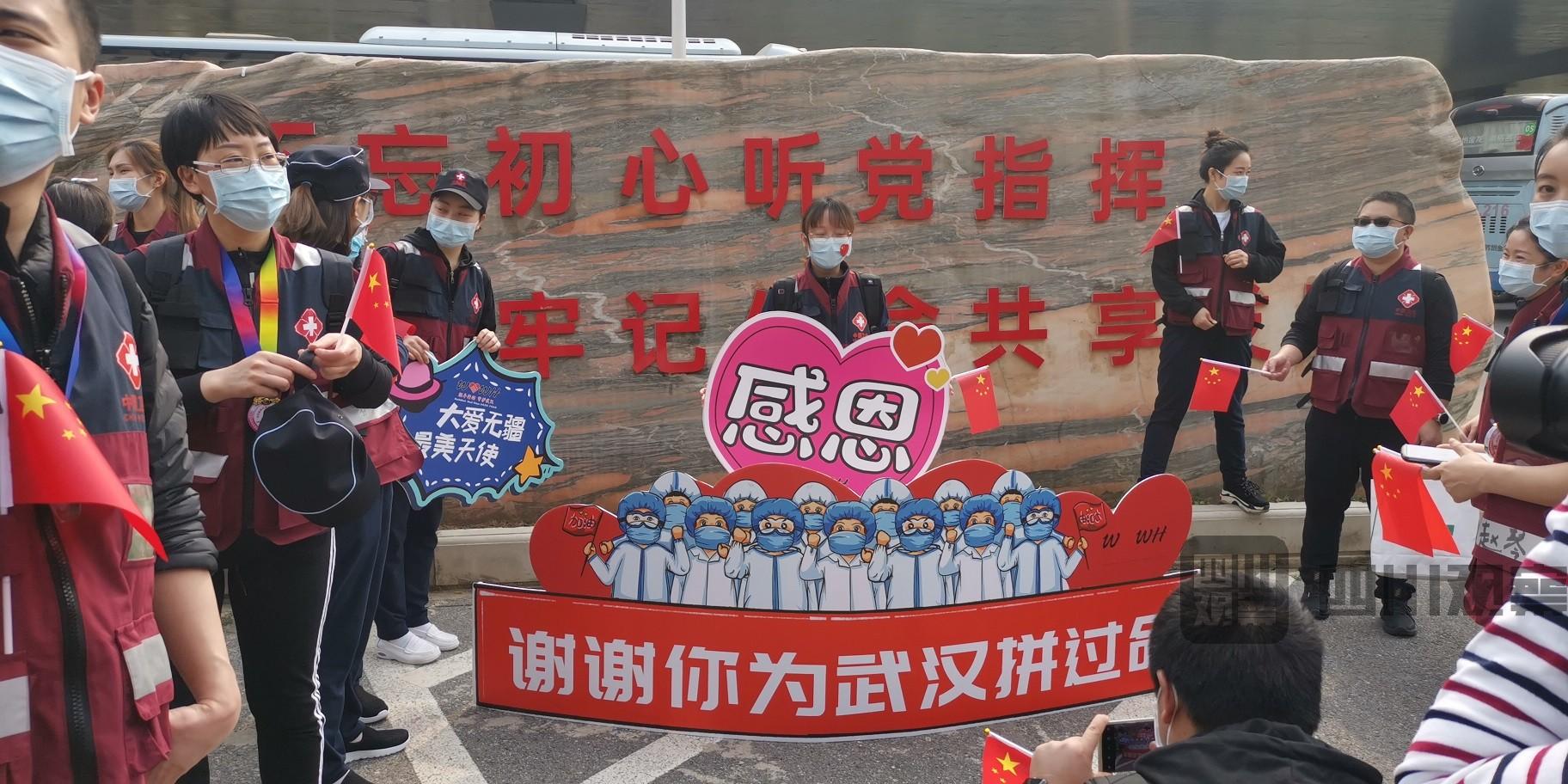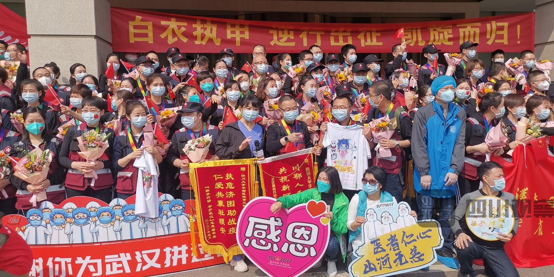 上午,最后一批四川援鄂医疗队队员从武汉启程回家。临别之际,曾经一同并肩作战的武汉“战友”们和武汉人民在道路两旁,举着横幅,挥舞着小国旗,送别华西医院的队员们。在现场,武汉医护人员还跳起了《听我说谢谢你》的舞蹈,向四川援鄂医疗队队员致意。