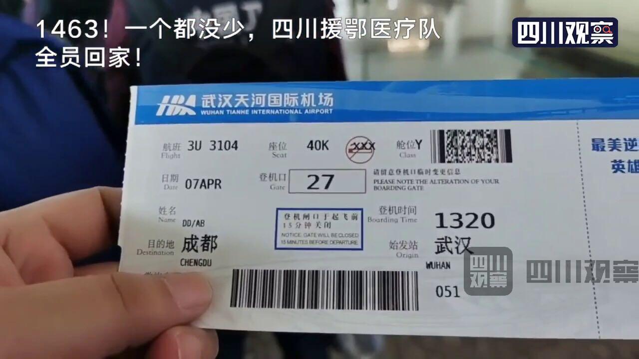 今天(4月7日)下午1点20分,最后一批返川医疗队员在武汉天河国际机场登机,预计下午3点半左右飞抵成都。