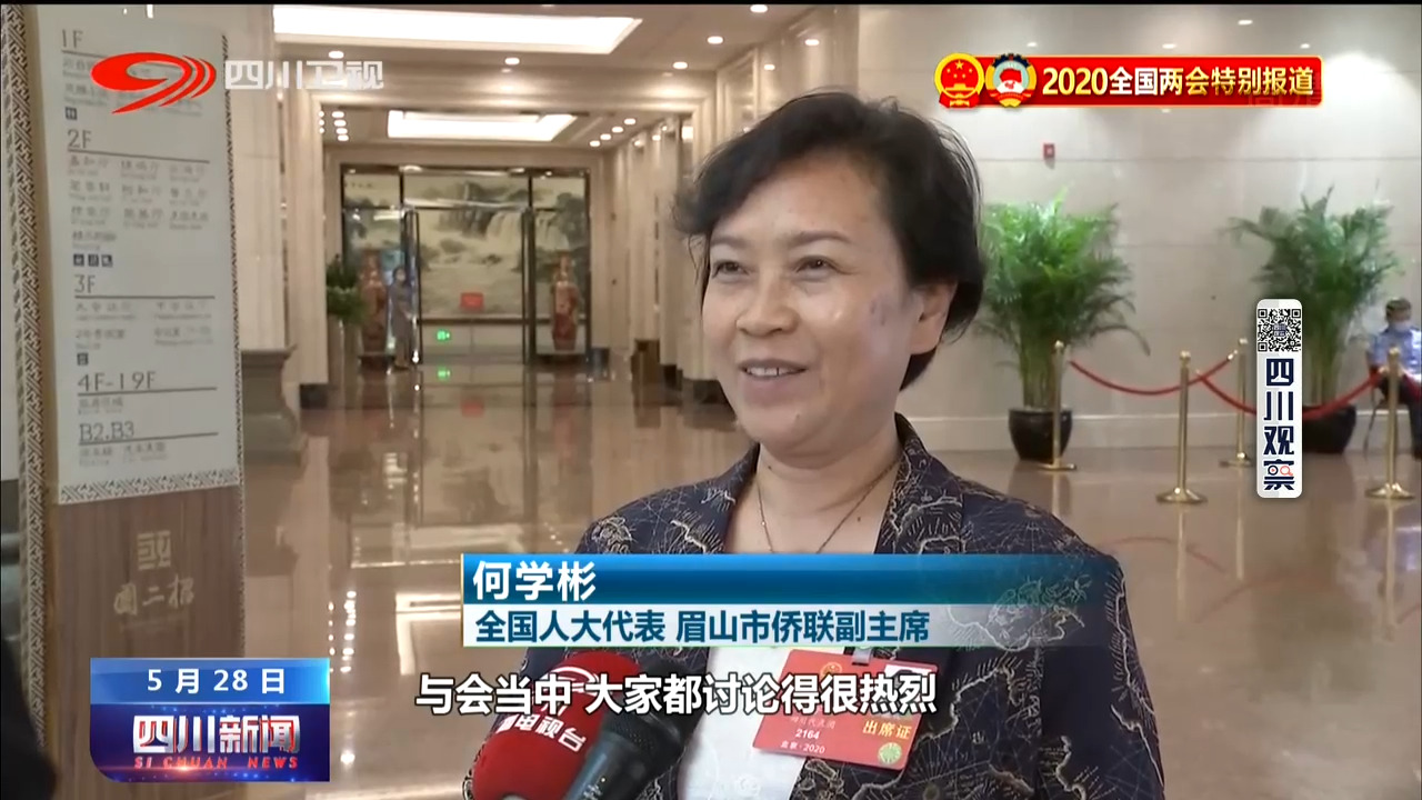 全国人大代表 眉山市侨联副主席 何学彬:与会当中 大家都讨论很热烈 提了很多好的建议 我都通过微信的形式,把大会(精神)传达给大家,给我们眉山的人民。