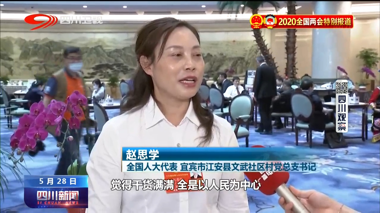 全国人大代表 宜宾市江安县文武社区村党总支书记 赵思学:听了几个报告以后觉得干货满满,全是以人民为中心。我回去以后将把这个会议精神及时(宣传)贯彻到老百姓当中去。