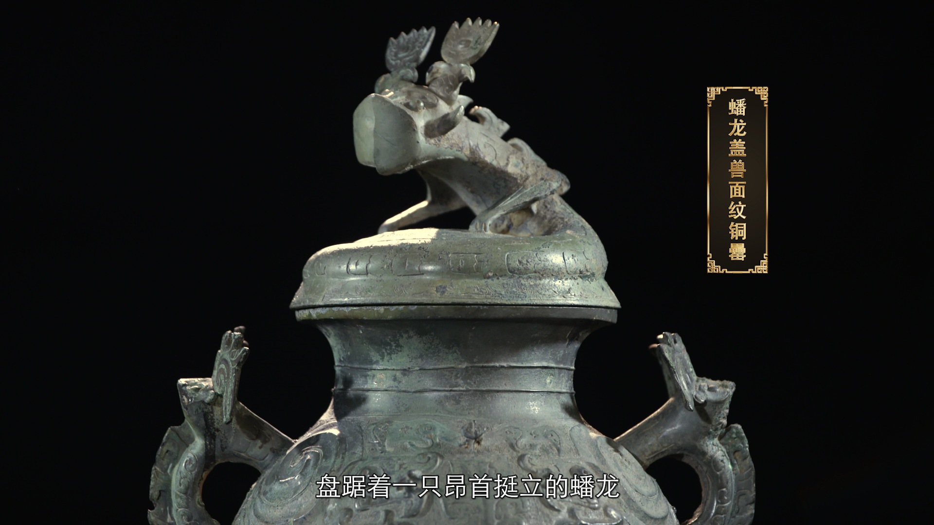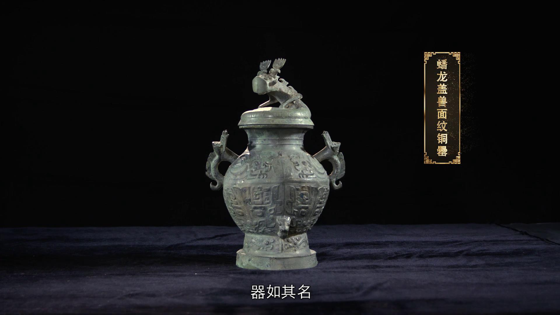 蟠龙盖兽面纹铜罍,器如其名,铜罍的器盖上盘踞着一只昂首挺立的蟠龙,蟠龙双目凸出,双足前踞,背部还饰有钩状的扉棱。在铜罍的肩部,装饰有两只夔龙纹的耳,罍身上则装饰着精美的纹饰,有兽面纹、夔纹、凤鸟纹等,造型别致,是商周时期青铜器的典型风格。
