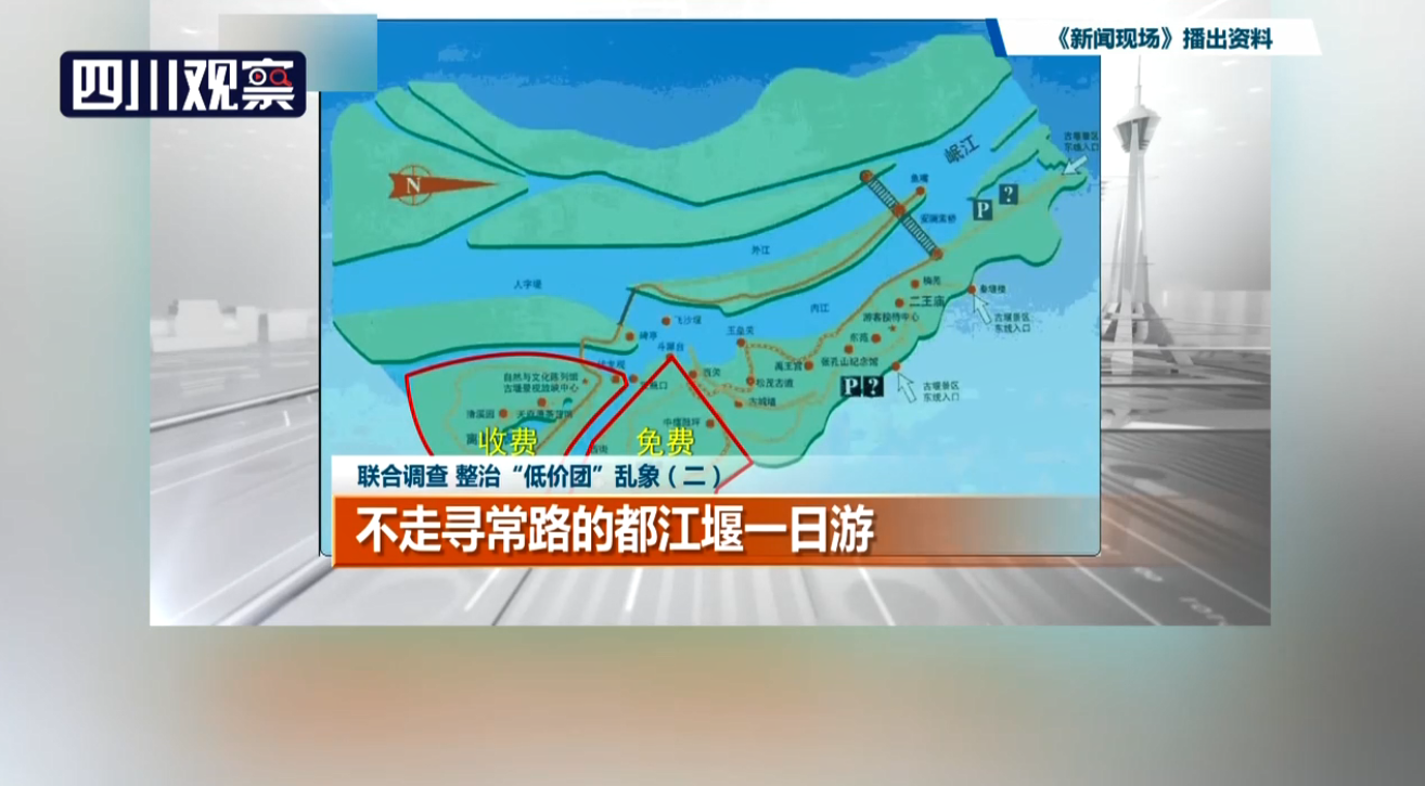 虽然这名“黑导游”一再宣称带着记者逛了该逛的景点,但是在调查中我们发现,其带我们去到的其实是免费的玉垒山公园,而其正对面的才是都江堰景区,需要购买门票进入的离堆公园。虽然两者都是玉垒山的一部分,但是离堆公园才是观看宝瓶口、飞沙堰等江水分流的最佳位置。