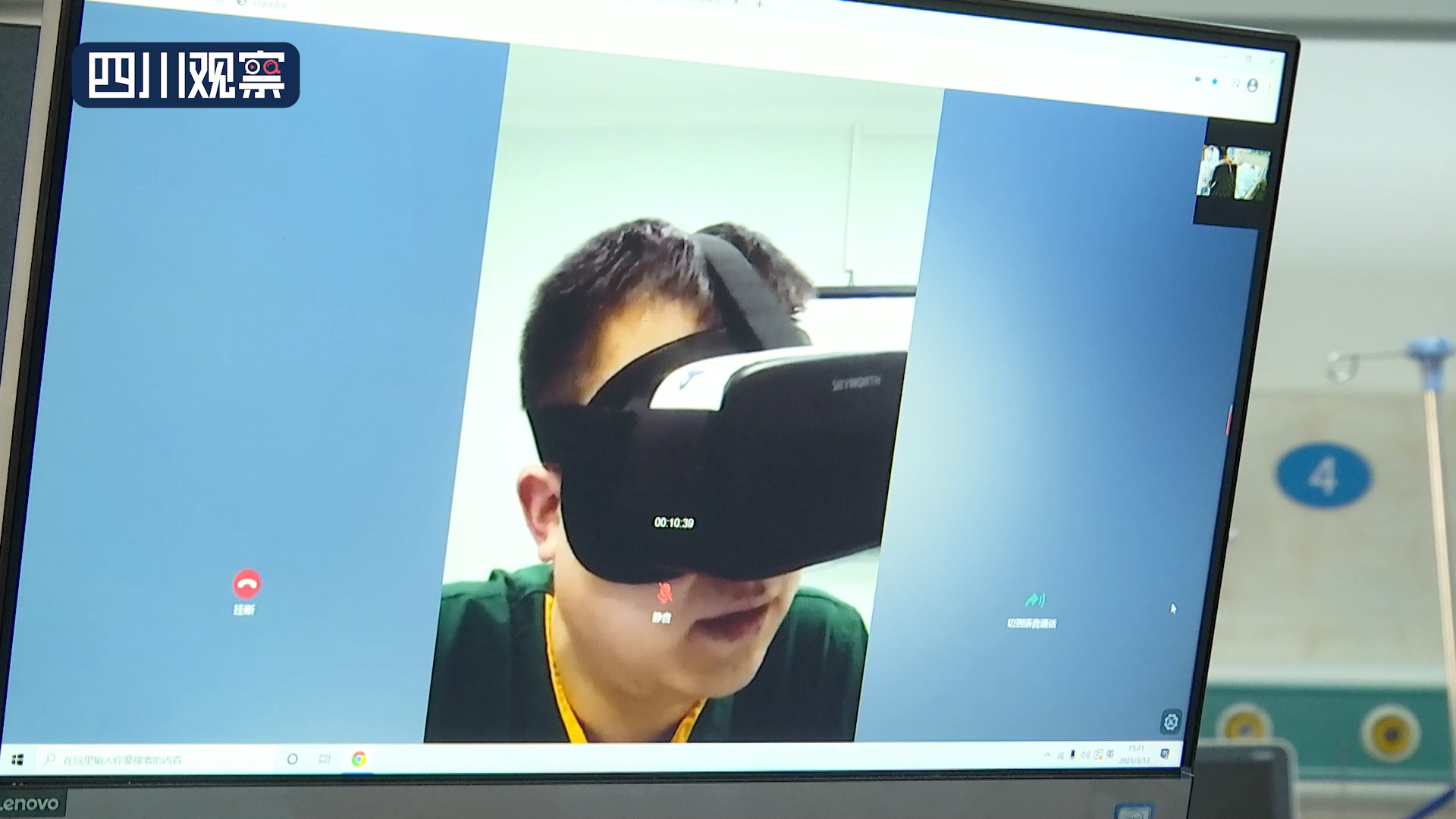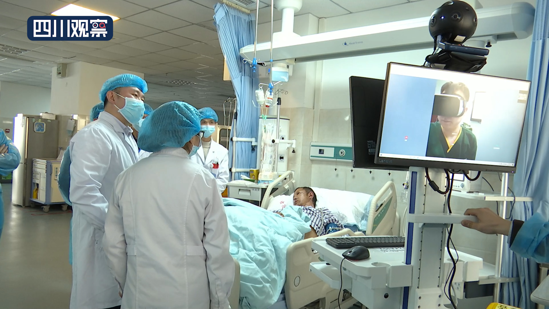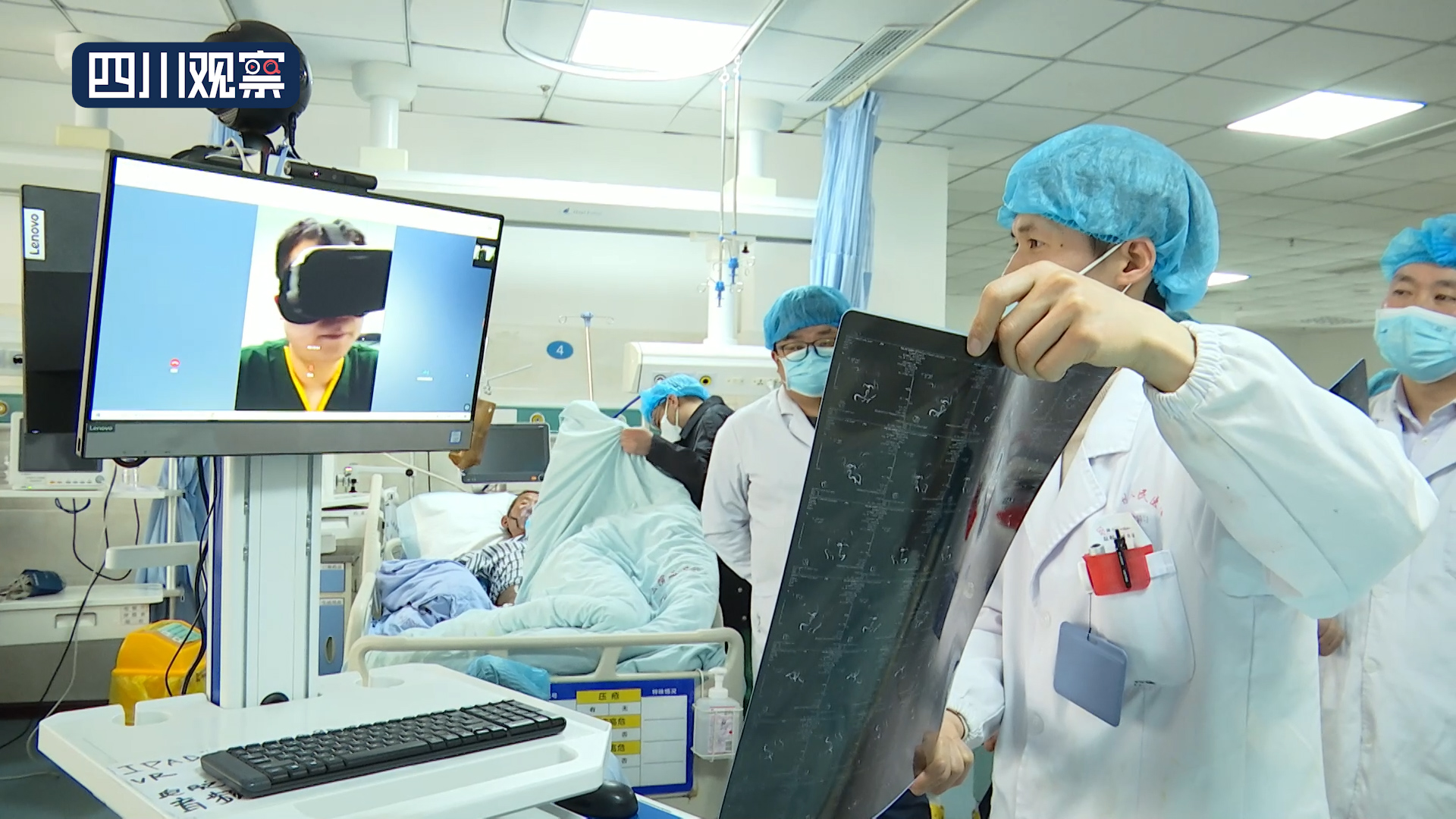 图为华西甘孜医院ICU病房,一名医生正在向四川大学华西医院重症医学科的金晓东主任和胡成功副主任医师汇报患者病情,屏幕那头,会诊专家则戴着VR眼镜,通过中国电信5G网络和医疗查房机器人,远程查看该患者病情。