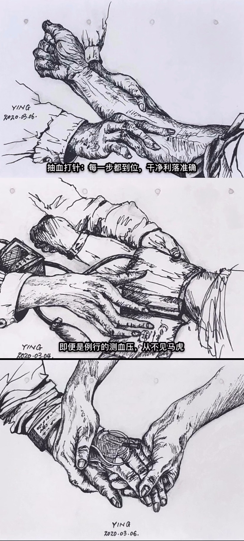 父亲住院期间,陈颖用一个便签本开始了最初的创作,画作以特写为主,都是医护人员在进行各项操作时手部的动作,有抽血、打针、测血压、消毒止血......最终完成的系列作品取名为“天使的手”,虽然只是局部,虽然是静态的黑白作品,但温暖却有力量。在完成“天使的手”后,陈颖又开始了全景纪实性创作,照顾过他父亲的医护人员和发生在医院的故事都成了她创作的对象,核酸检测、医生查房、保洁大爷、护工小陈、隔窗相见的祖孙,更有医院外24小时营业的小商贩,人情的温暖点滴都跃然纸上。