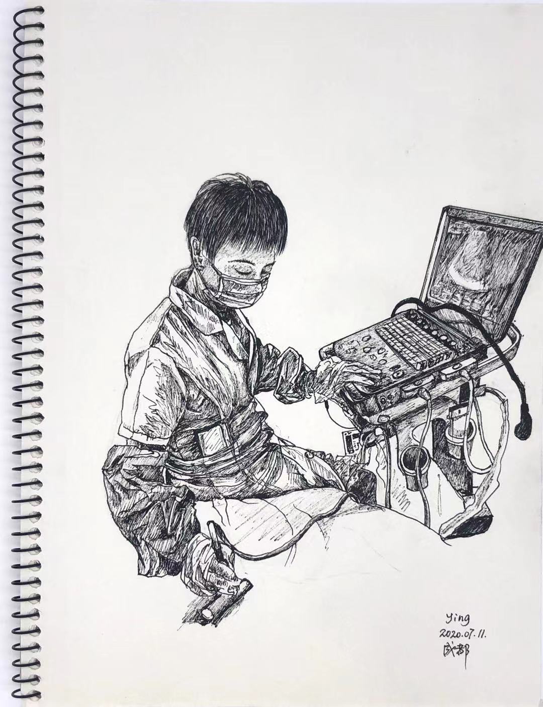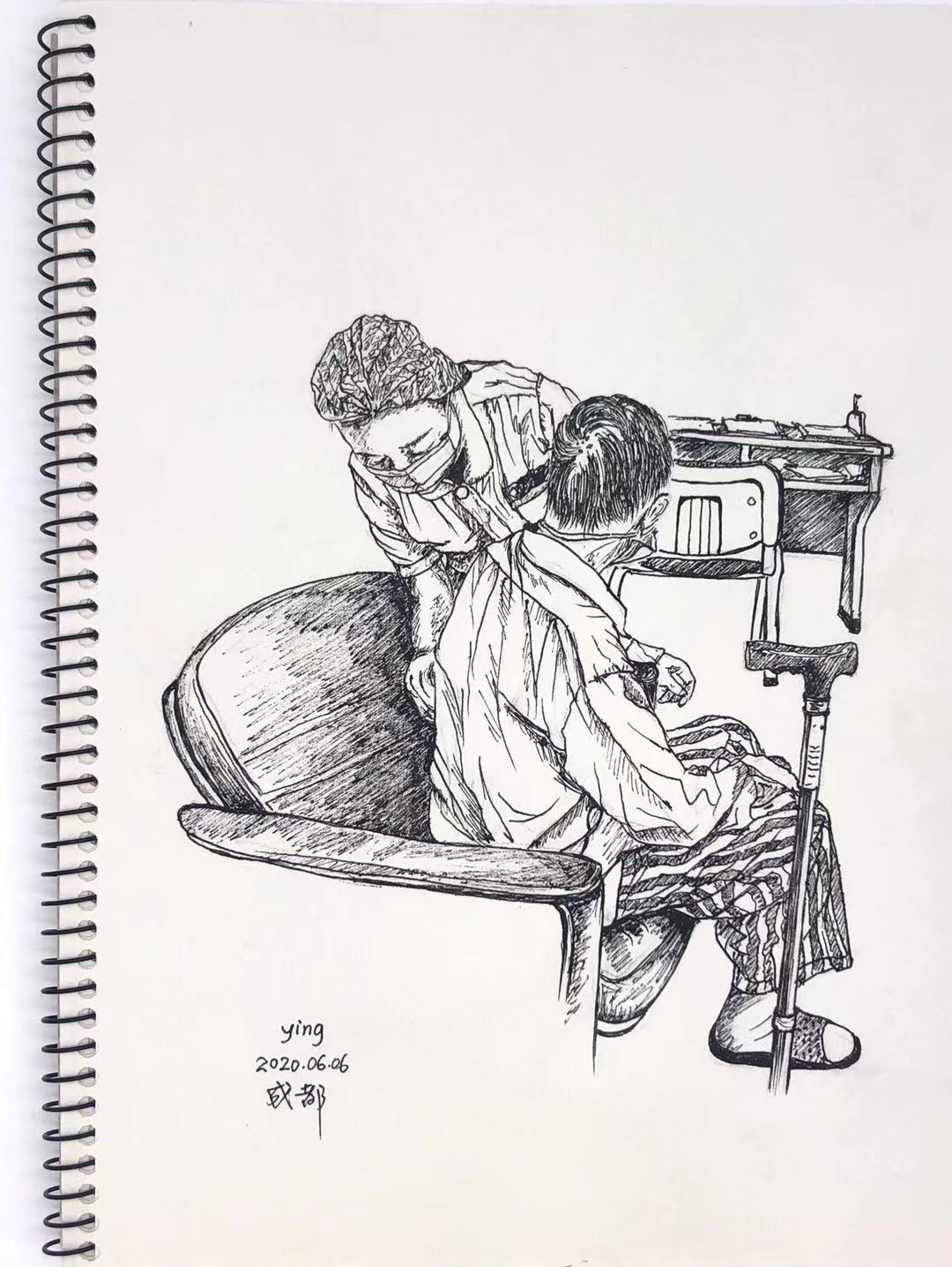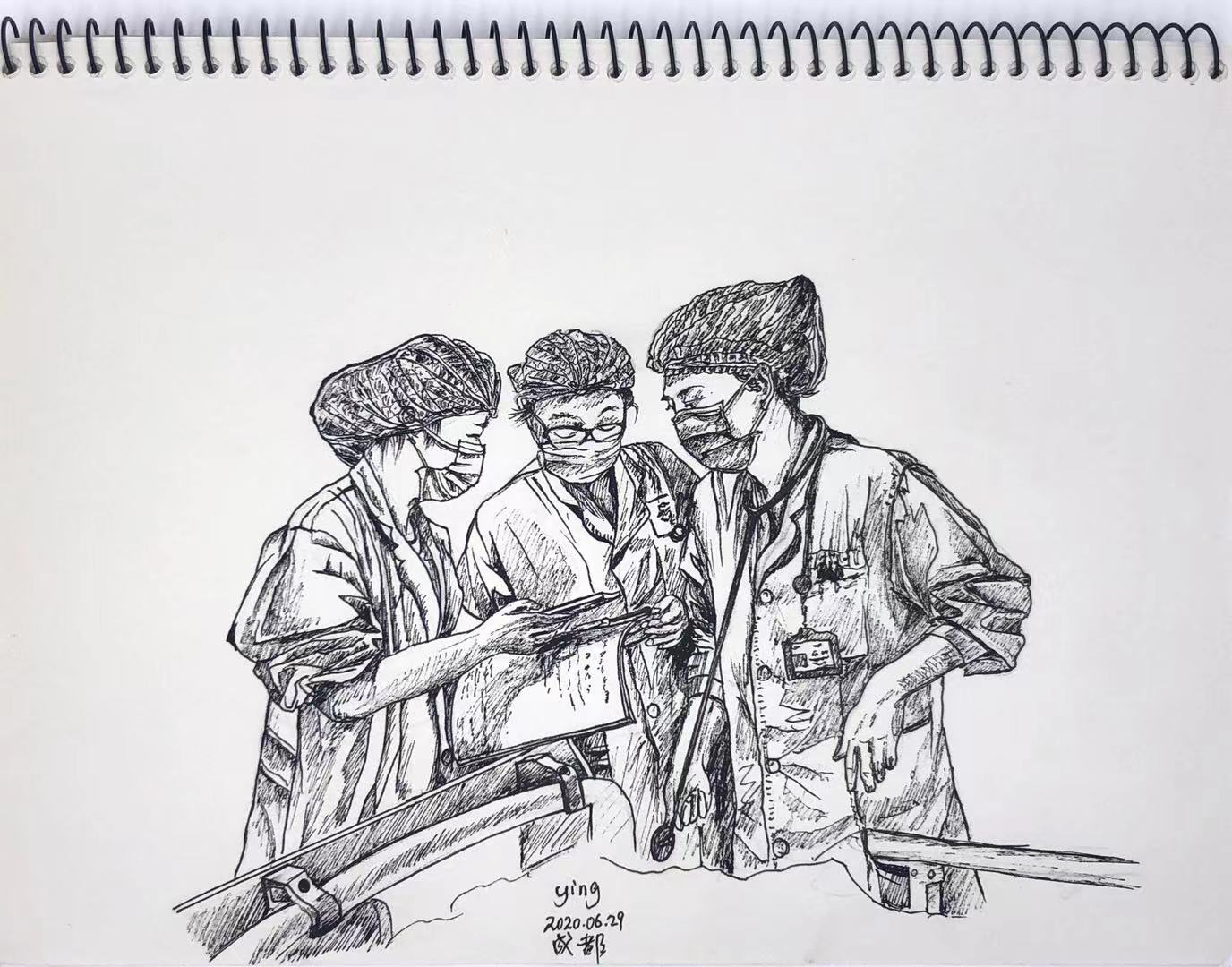 她叫陈颖,2020年,陈颖的父亲因病先后两次住进了四川省人民医院,在照顾父亲住院期间,她画下了近百张医护人员工作时的样子,“他们为患者治疗时专注细致的样子让我感动,我用画来表达感谢。”