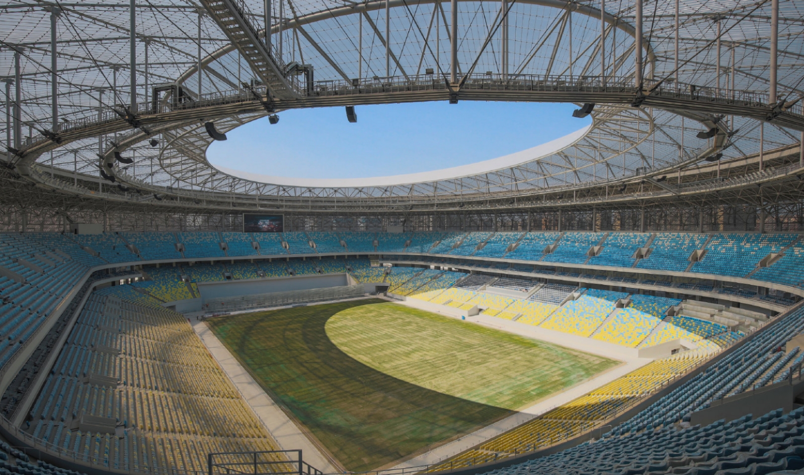 据了解,凤凰山体育场建设标准要求非常高,且结构造型复杂、曲率曲线面多。足球场屋面采用了全国首例大开口索穹顶结构形式,施工难度在国内同类建筑中首屈一指。