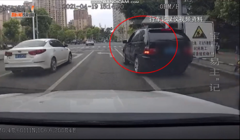4月19日这天下午3点12分,南充市民王先生驾车正在路口等红绿灯,此时对向车道有一辆黑色宝马越野车正在违规压线掉头。